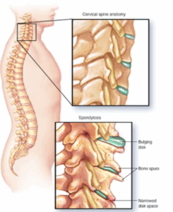 Cervical spondylosis is a general term for age-related wear and tear affecting the spinal disks in your neck. As the disks dehydrate and shrink, signs of osteoarthritis develop, including bony projections along the edges of bones, known as bone spurs.