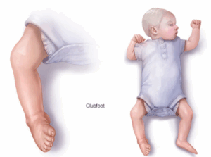 Clubfoot describes a condition present at birth in which a baby's foot is pointed in and down. The tissues connecting the muscles to the bone are called tendons. In clubfoot, the tendons are shorter than usual, pulling the foot out of position.